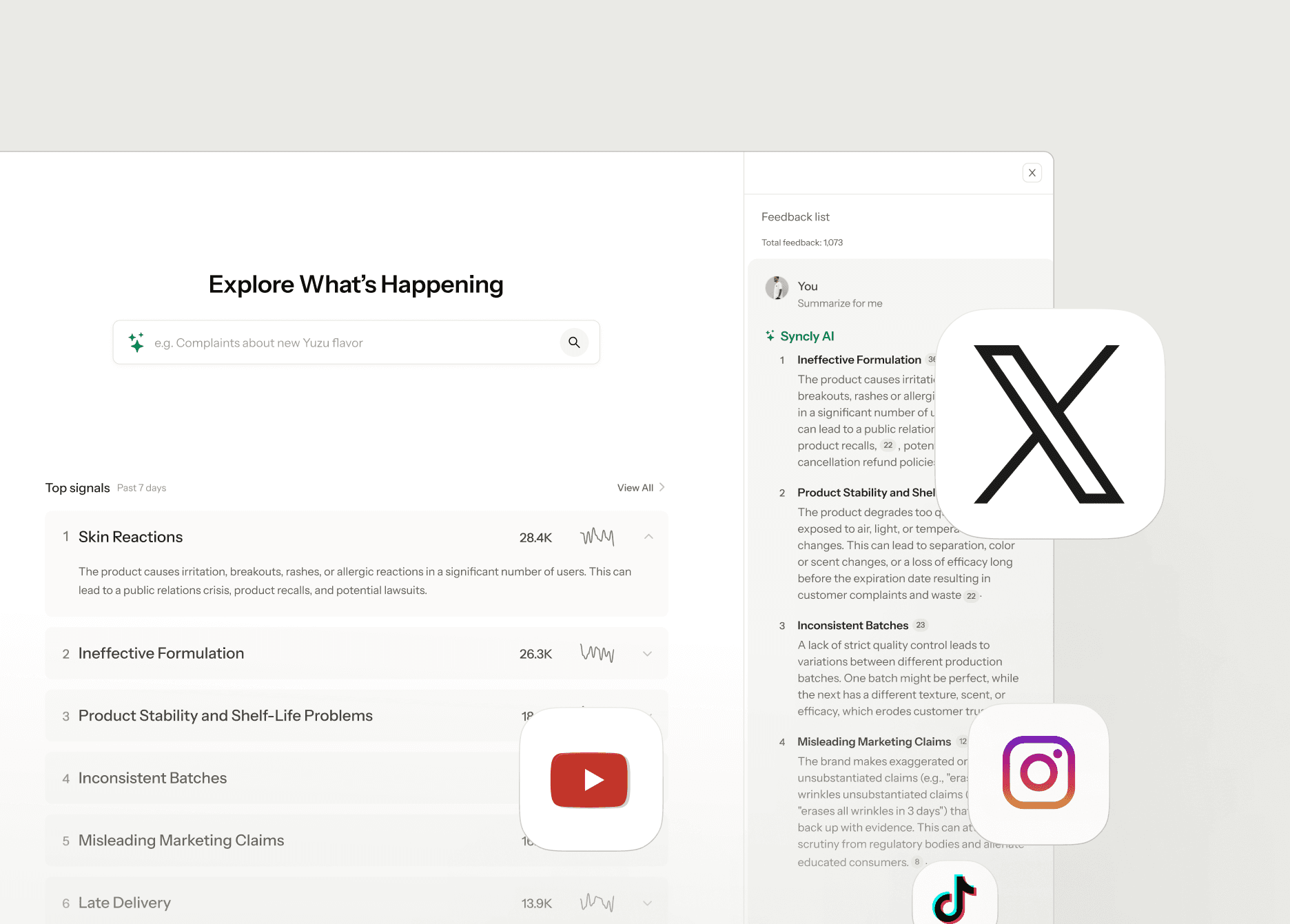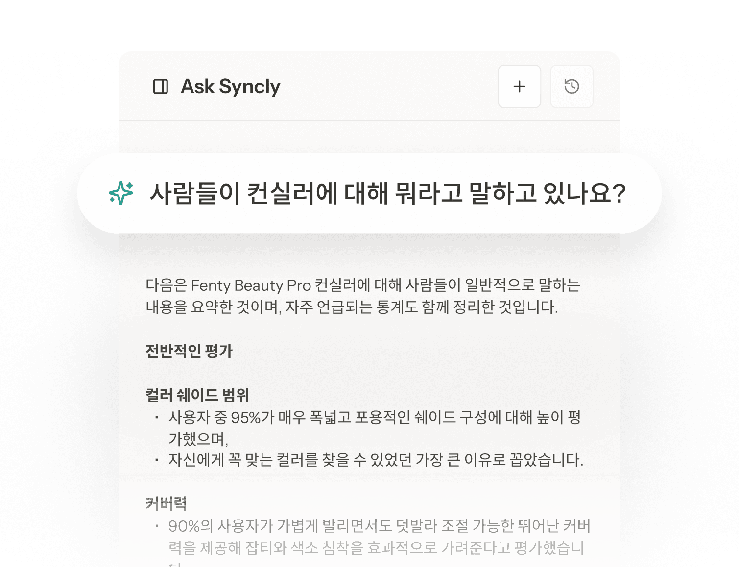 데이터를 직접 분석하려 헤맬 필요 없습니다. "경쟁사 대비 우리의 강점은?" 처럼 말하듯 질문만 던지세요. Hey Syncly가 데이터를 분석해 실행 가능한 답변을 도와드립니다.