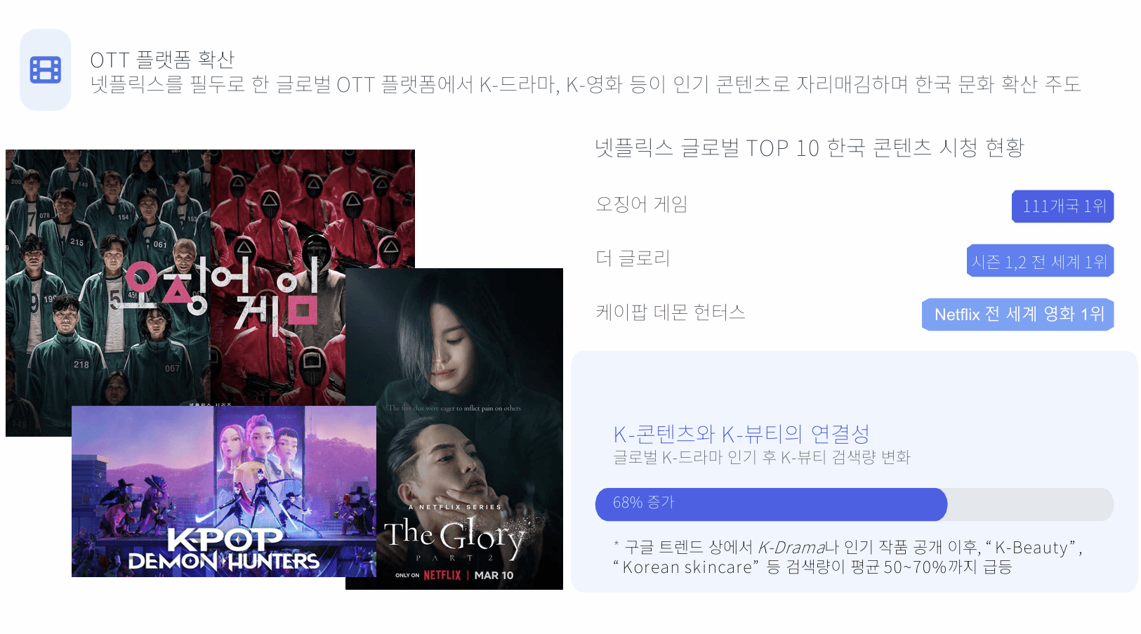 김 팀장은 K-뷰티가 서구권 시장의 높은 진입 장벽을 넘을 수 있었던 가장 큰 원동력으로 K-콘텐츠를 꼽았습니다. 예능, 드라마 등 한국의 콘텐츠가 글로벌 OTT를 통해 확산되면서, 한국 화장품에 대한 낯설음과 경계심이 자연스럽게 허물어졌다는 것입니다.