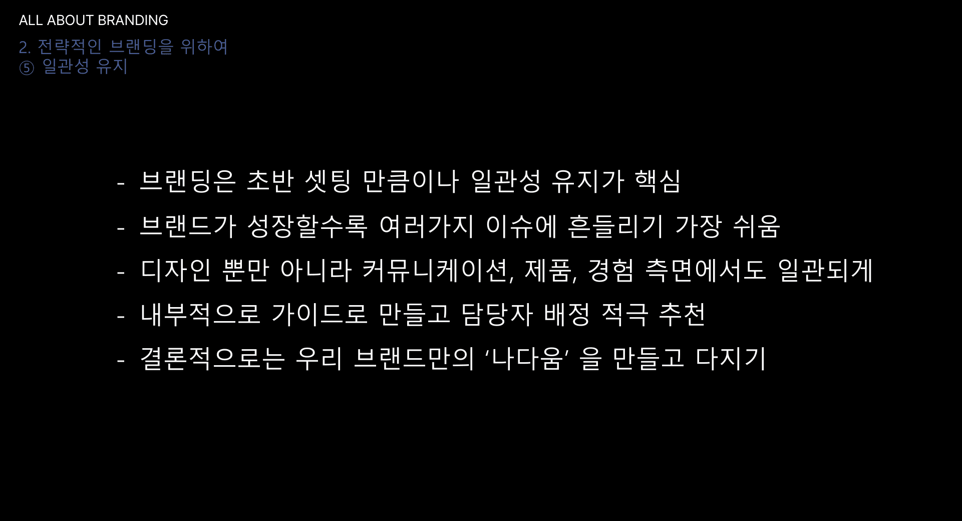 내부적으로 뛰어난 감각을 가진 크리에이티브 디렉터가 없더라도, “이건 우리 브랜드 답지 않습니다”라고 말하며 원칙을 지키는 한 사람이 있다면 그 브랜드는 일관성을 유지할 수 있습니다. 브랜딩은 멋진 로고를 만드는 것이 아니라, 정해진 방향성을 뚝심 있게 밀고 나가는 과정 그 자체이기 때문입니다.
