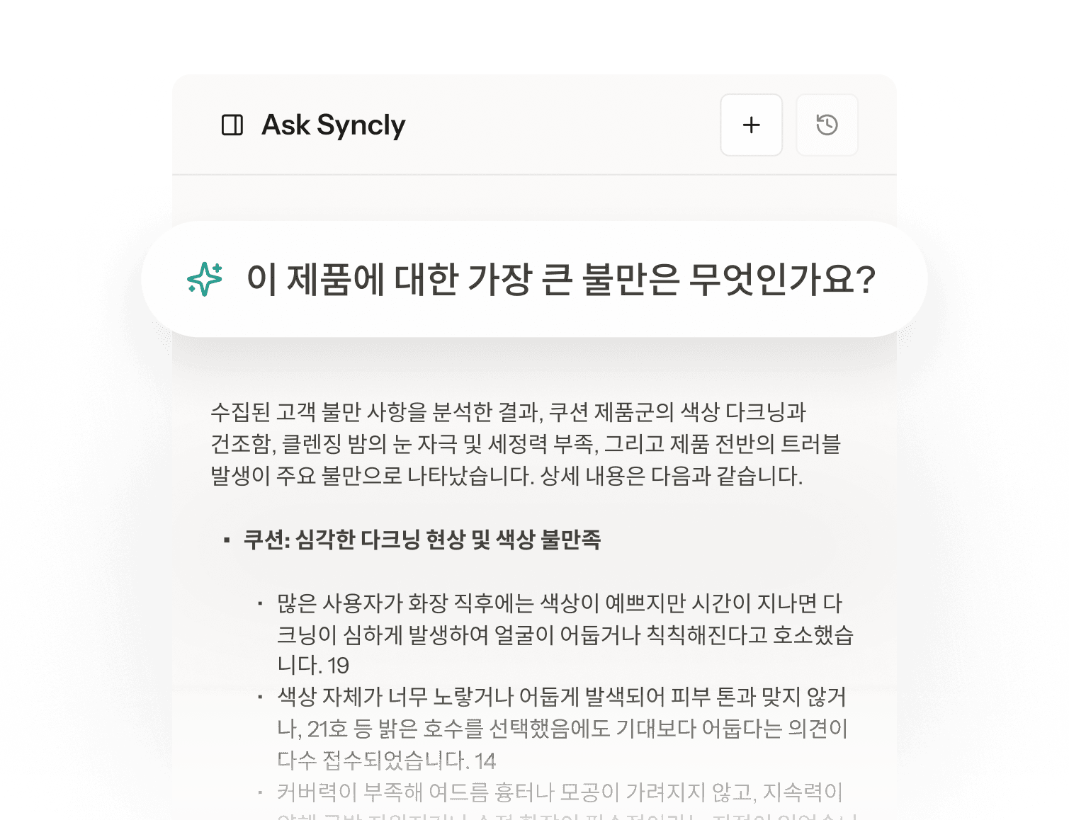 싱클리를 활용하면서 그동안 몇 달씩 걸리던 글로벌 소비자 리서치를 단 1–2주 만에 체계적으로 마칠 수 있었고, 정성 데이터까지 정리된 형태로 확인할 수 있었습니다. 특히 국가별·제품별로 정리된 분석 결과와 인사이트는 실제 의사결정에 바로 활용할 수 있을 만큼 명확했고, 경영진 역시 싱클리의 분석 깊이와 인사이트의 신뢰도에 매우 만족했습니다.