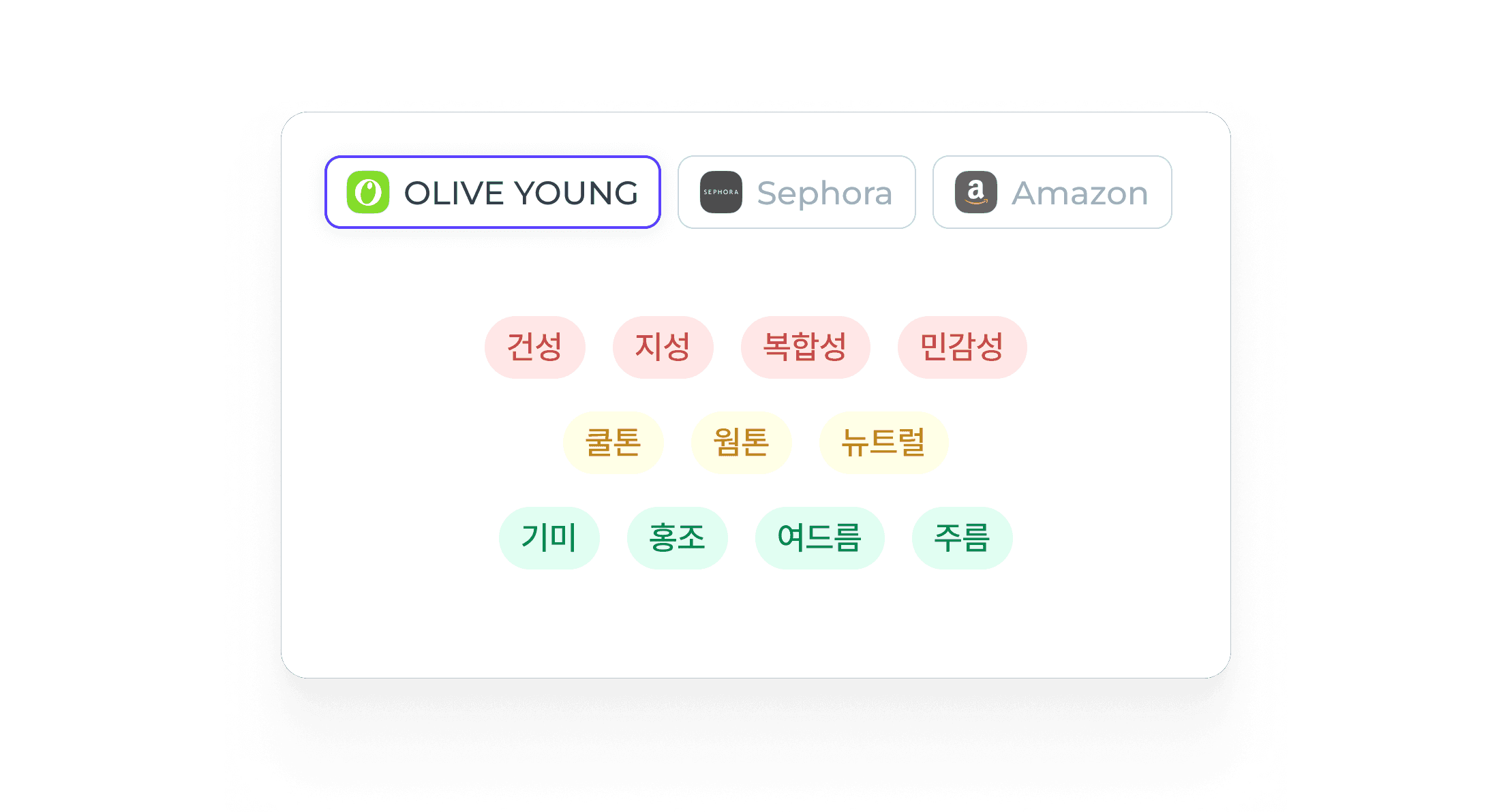 올리브영, 아마존, 세포라 등 주요 채널의 제품 링크만 입력하면 리뷰가 수집되고, AI가 광고성 리뷰를 걸러내 진짜 반응만 모아드립니다.