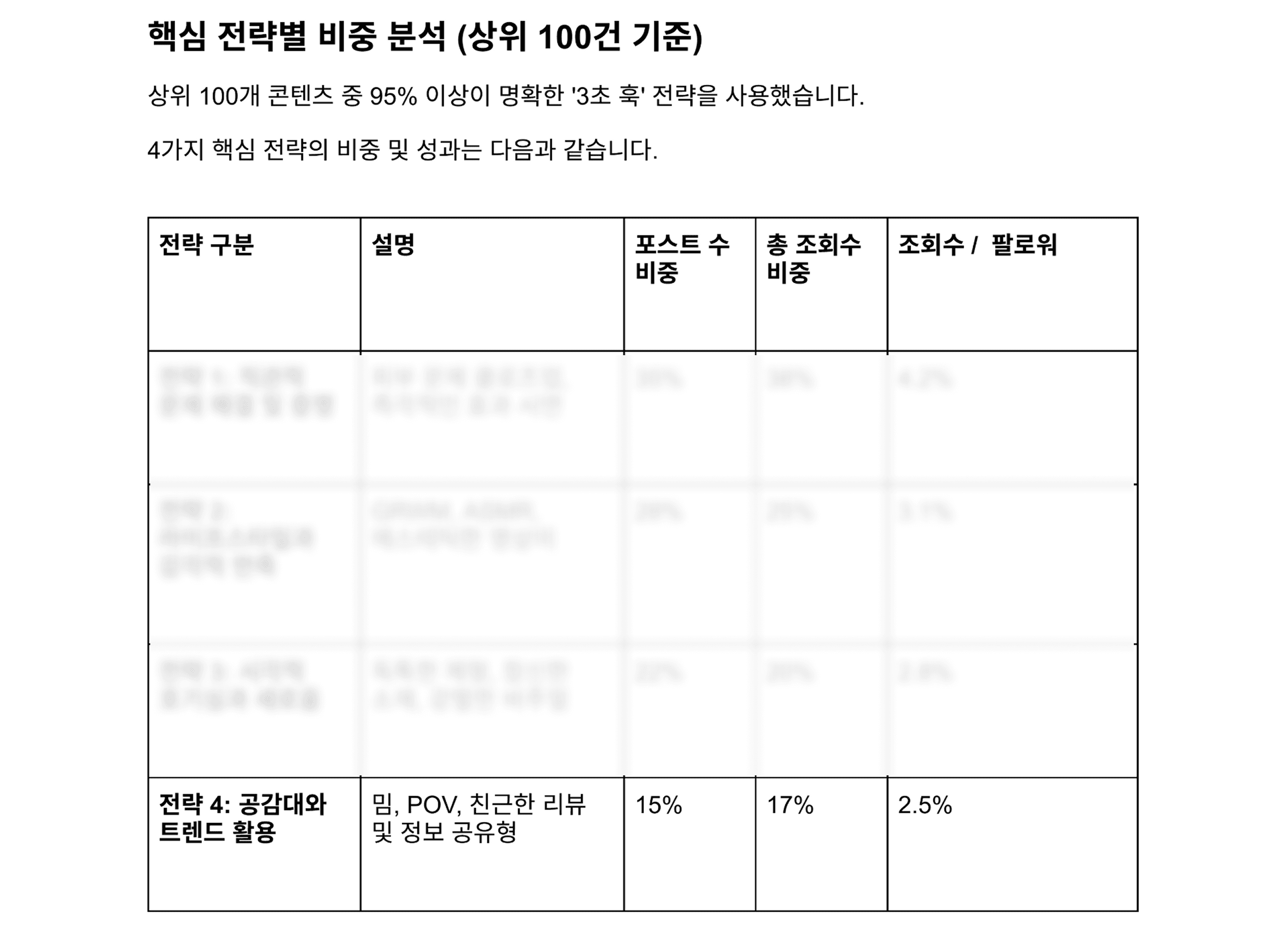– 밈·POV 형식, 비밀 공유 톤 등나머지 핵심 전략은 리포트를 통해 확인하세요.