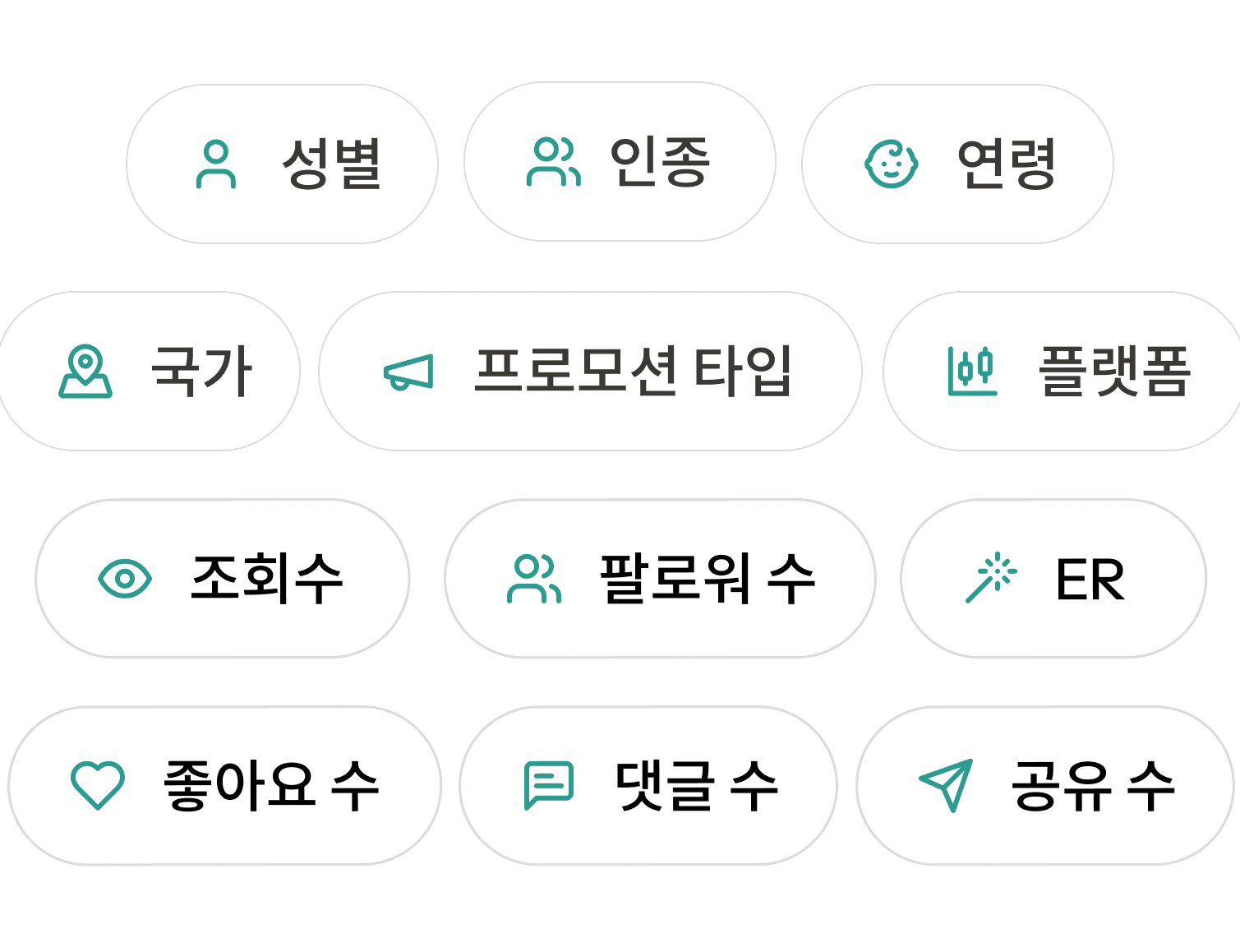 팔로워 수, 참여율 지표는 물론 인종·국가·연령대까지 다양한 기준으로 목적에 맞는 크리에이터를 선별할 수 있습니다.