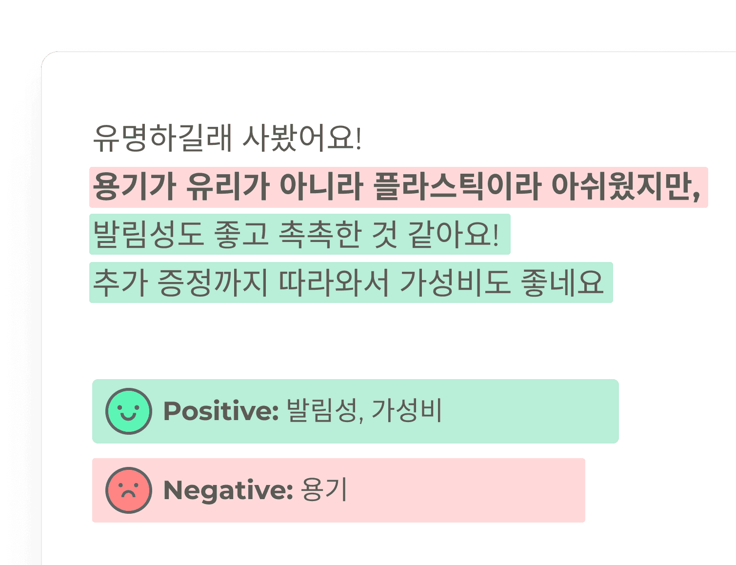 5점 만점 리뷰 안에 포함된 “하지만 ~ 아쉬워요”와 같은 핵심 개선 포인트를 구조적으로 포착하지 못하고 있습니다.